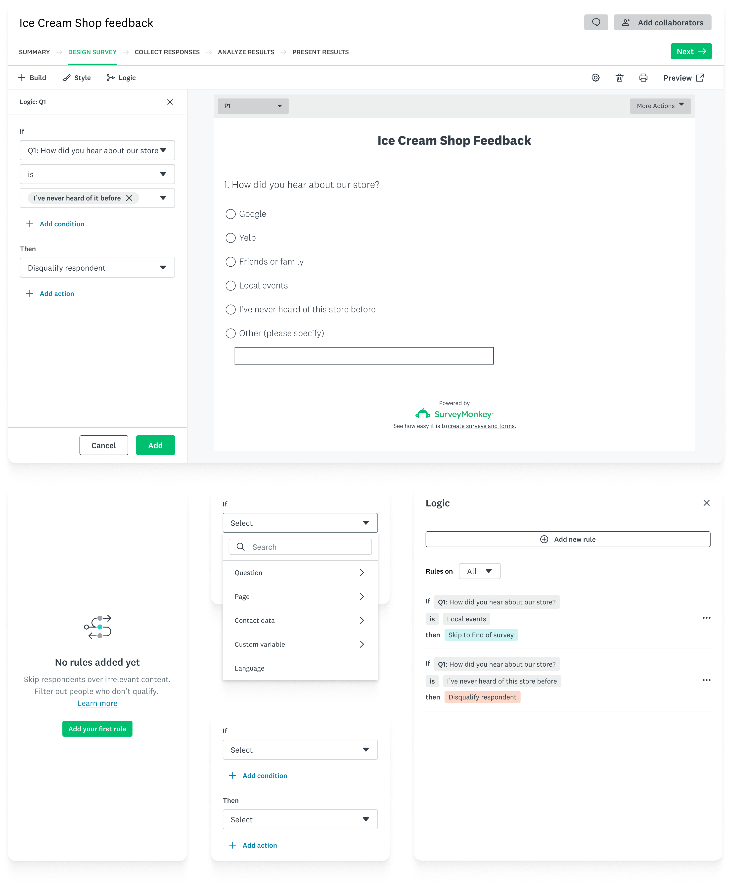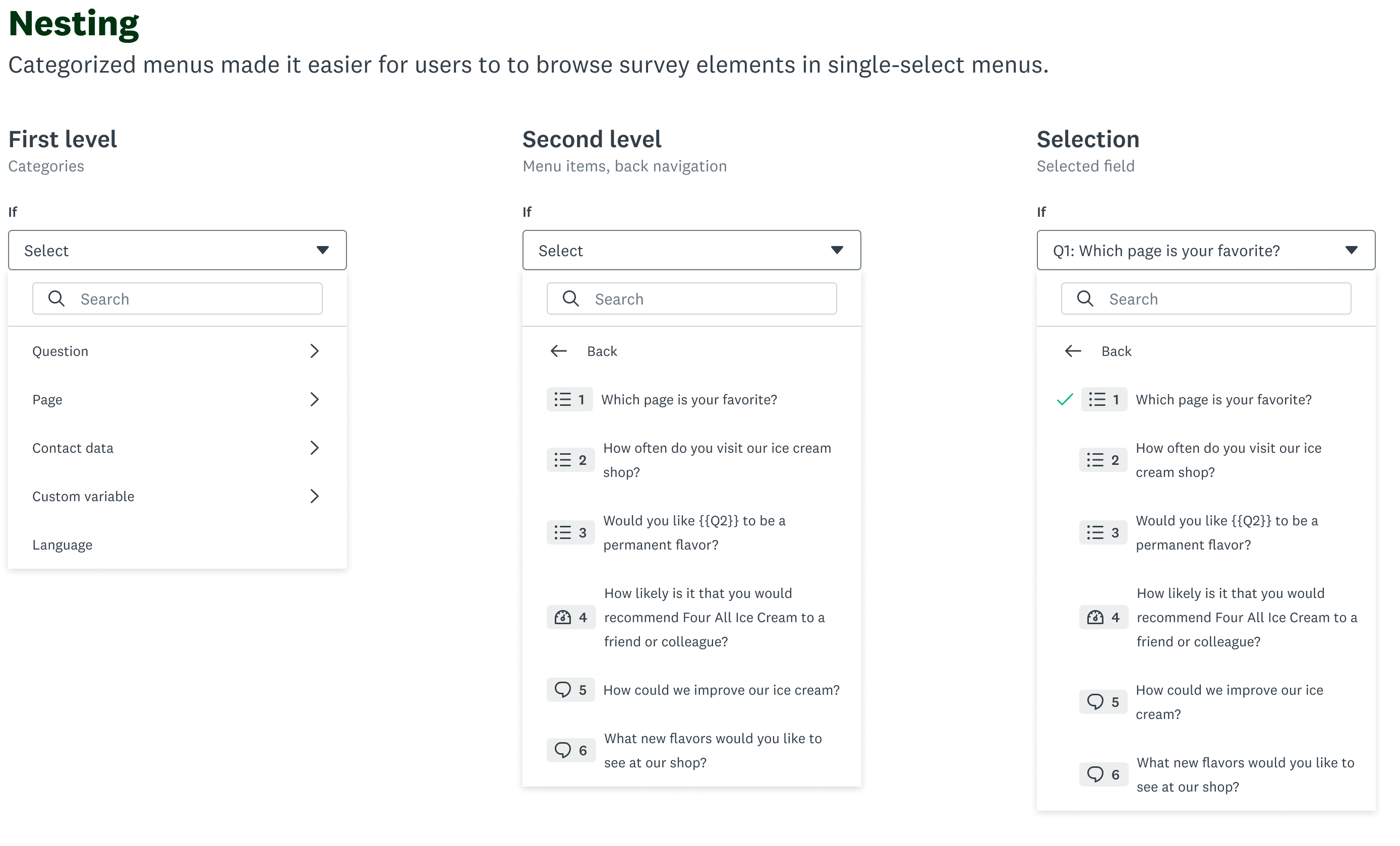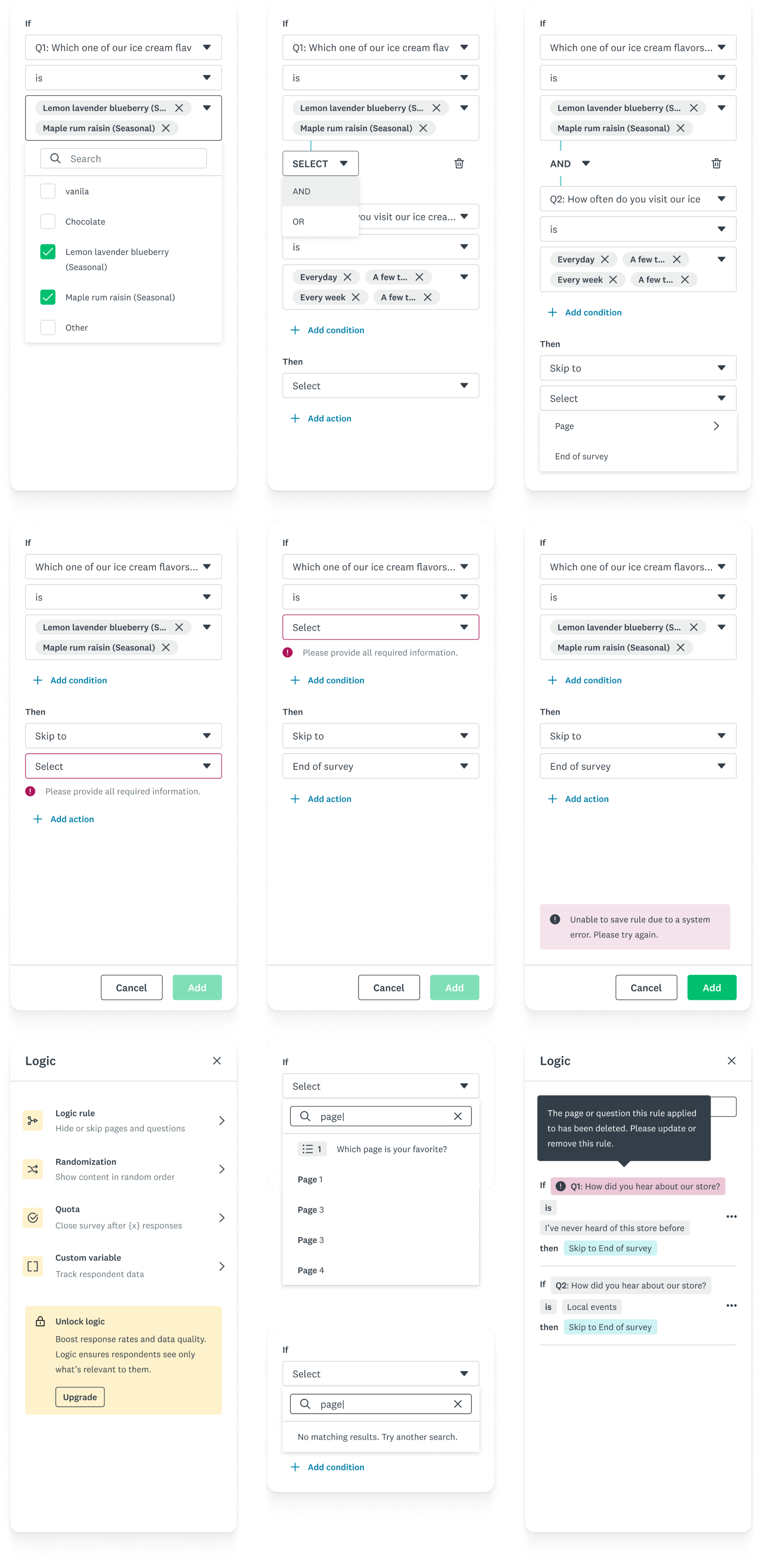 The creation of the logic building patterns sparked some thoughts with other designers, who began exploring what that could mean elsewhere within SurveyMonkey. I was responsible for sharing the patterns across team, elevating the select component to a design system level, and working with engineers so that it could be consumed across the platform.