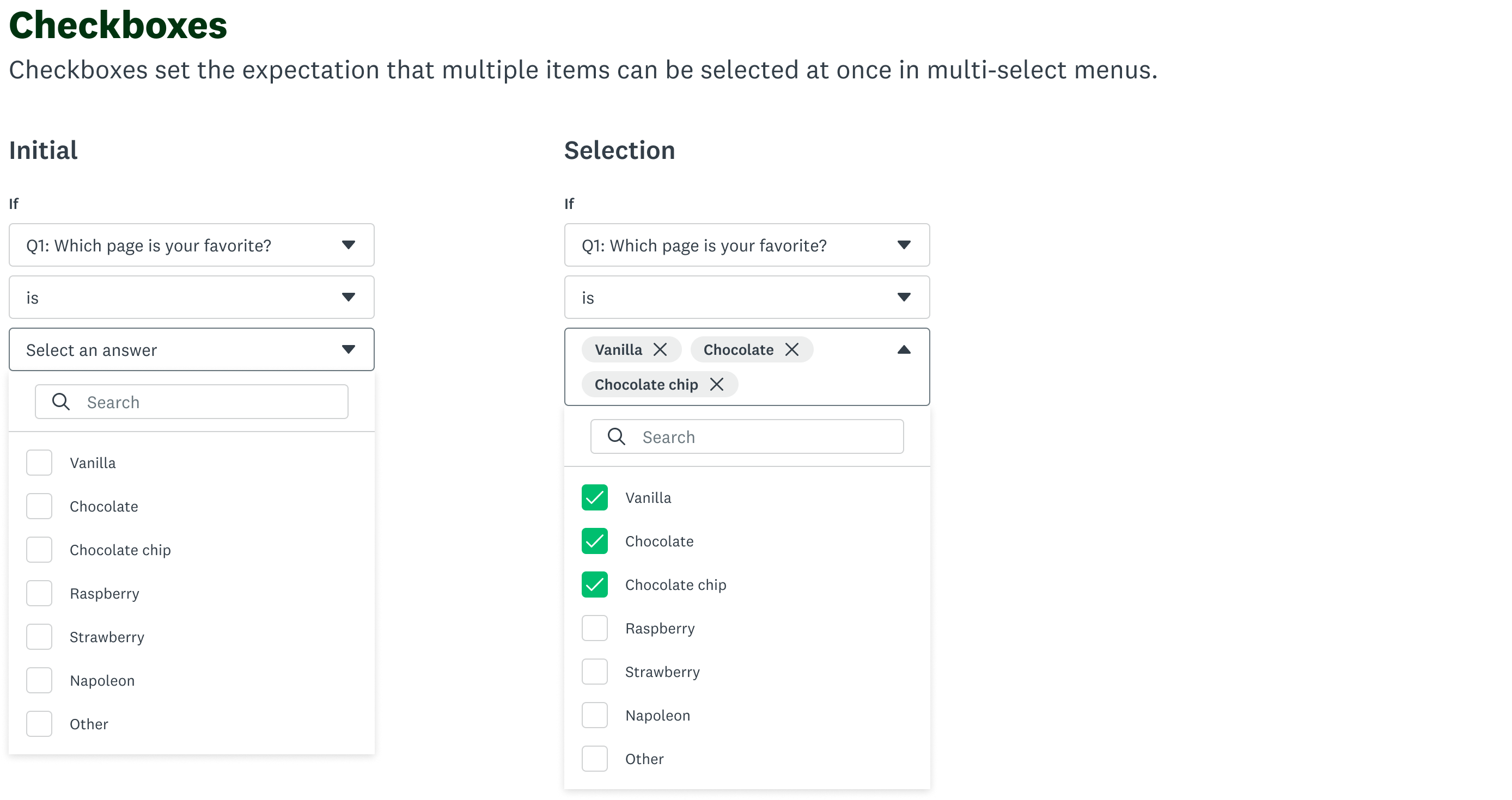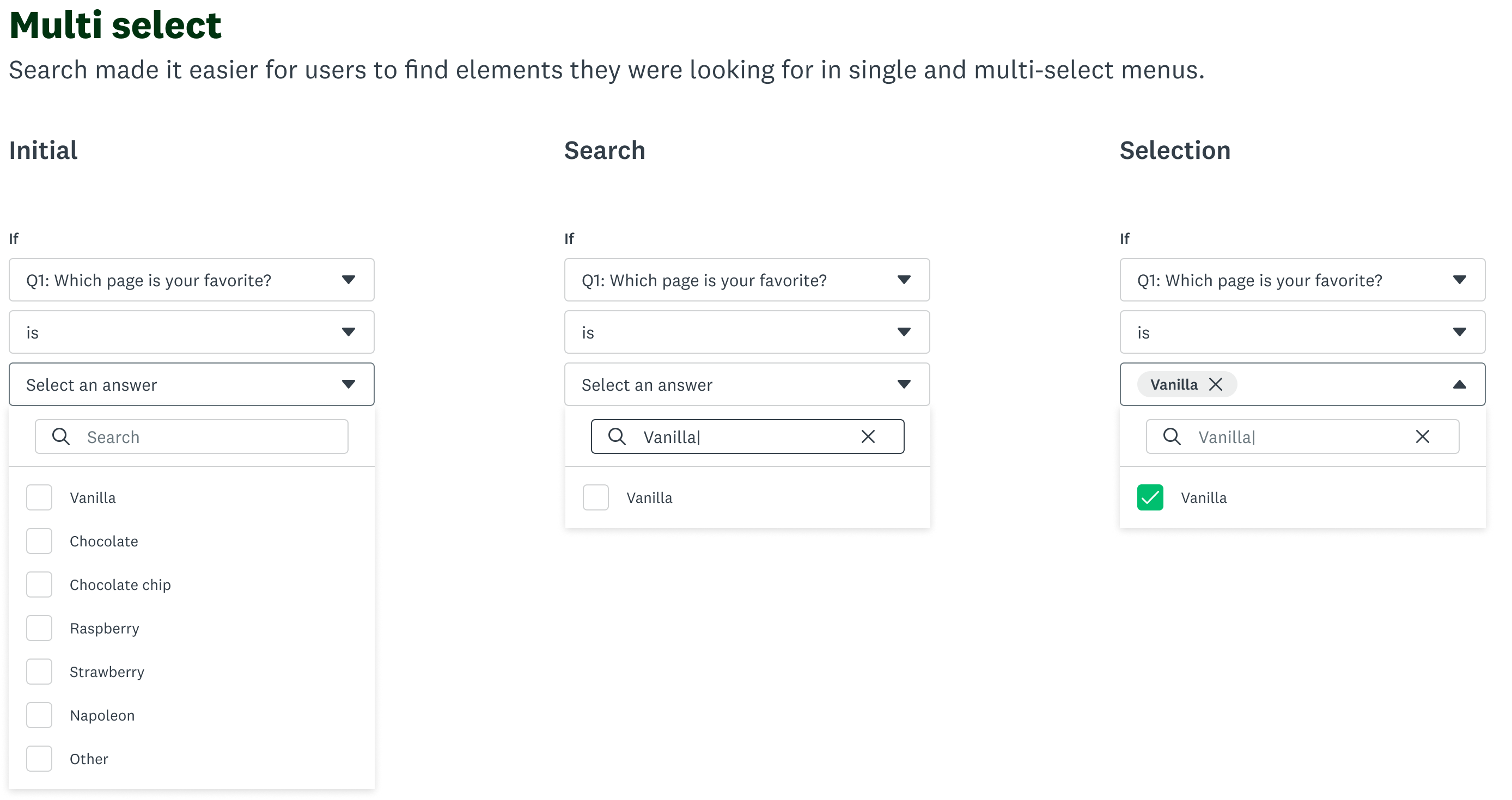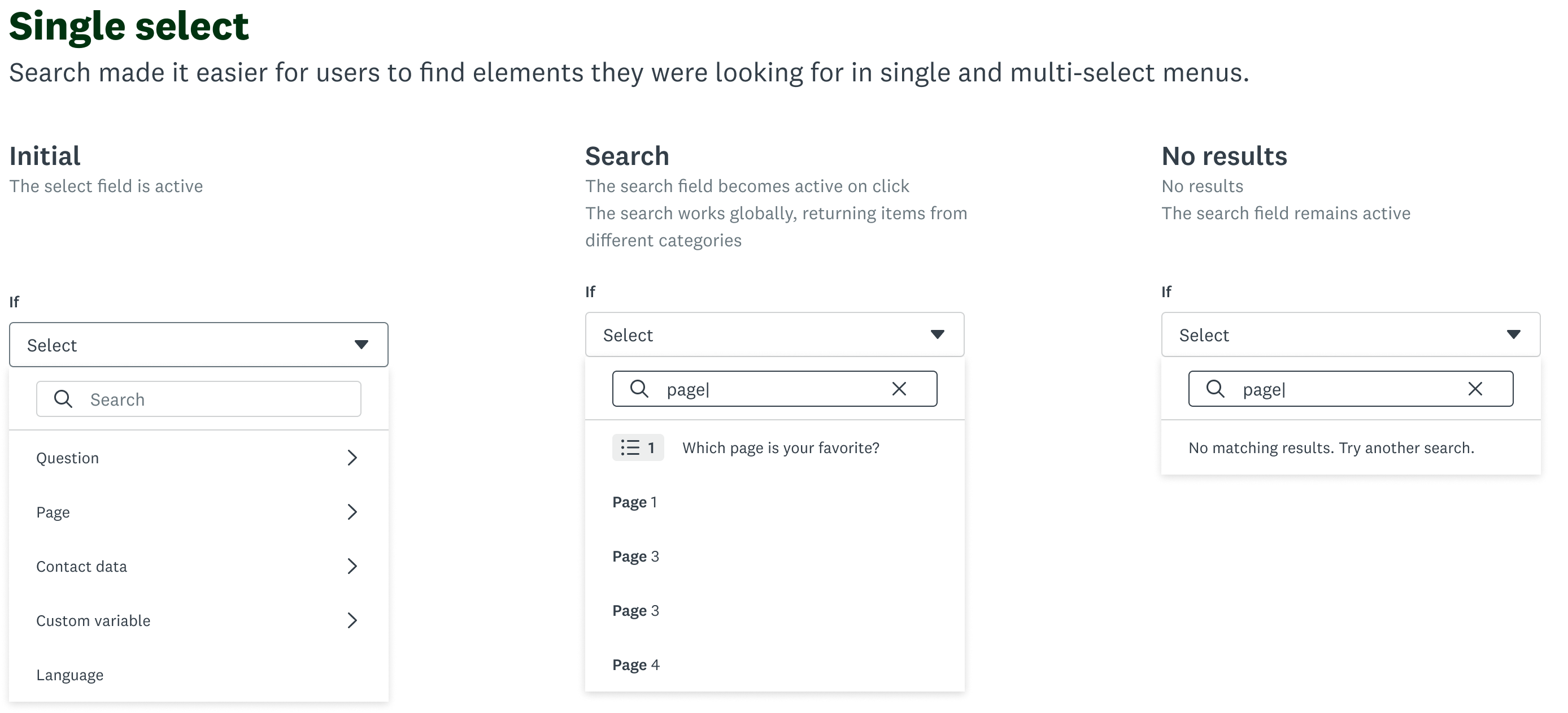 The creation of the logic building patterns sparked some thoughts with other designers, who began exploring what that could mean elsewhere within SurveyMonkey. I was responsible for sharing the patterns across team, elevating the select component to a design system level, and working with engineers so that it could be consumed across the platform.