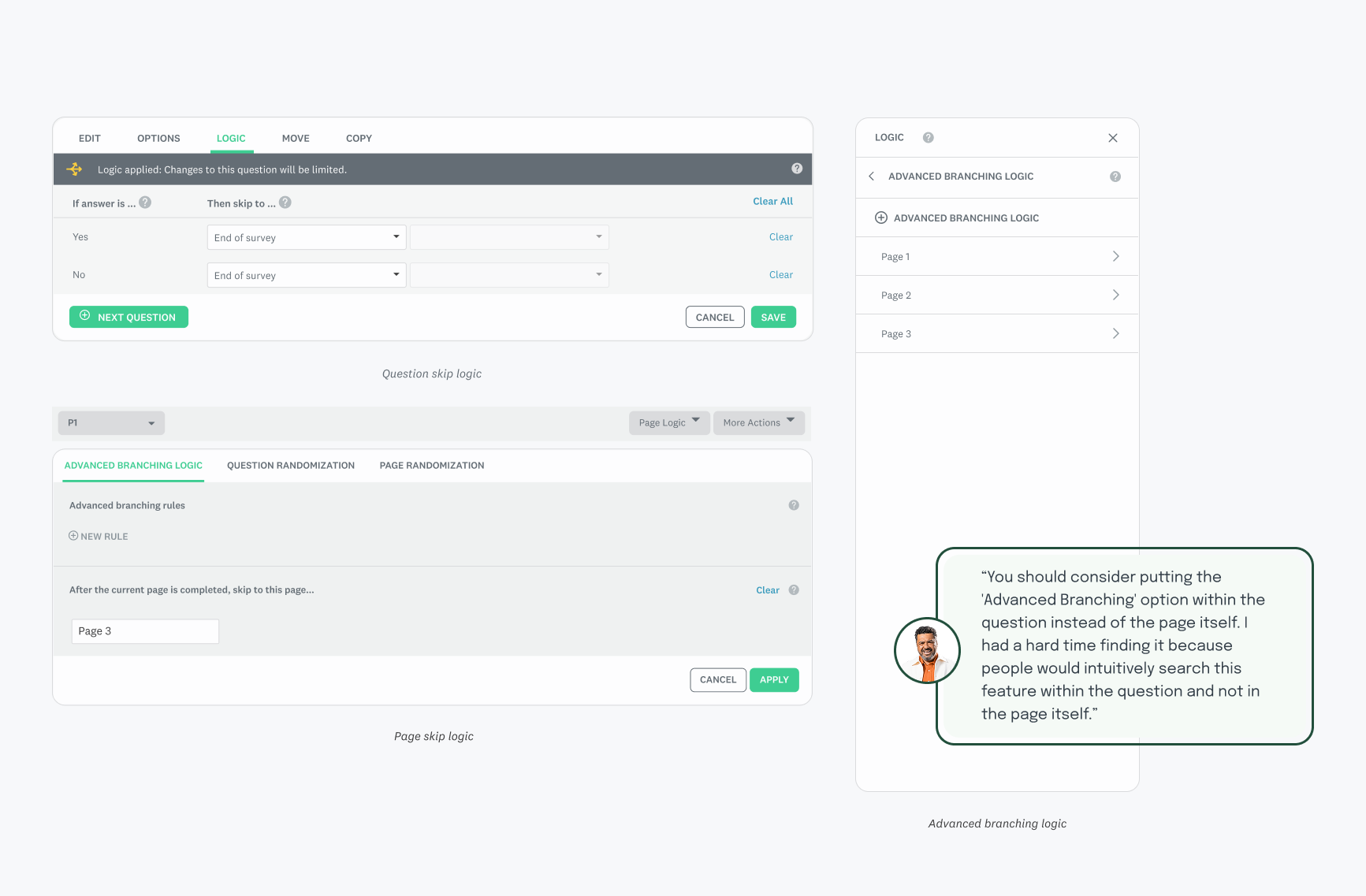 Due to historical reasons, we’ve broken logic into question skip, page skip, and advanced branching. As a result, each logic type has its own unique entry point and UIs, making the overall experience inconsistent and largely disconnected.