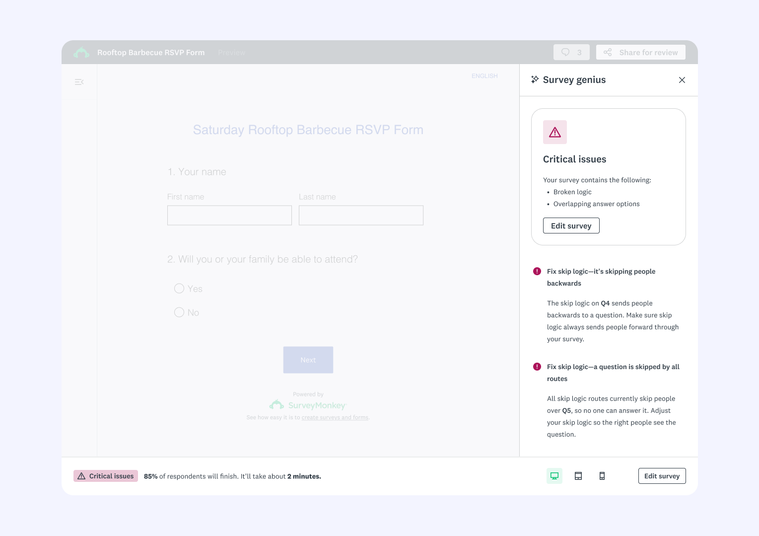 We redesigned the Genius recommendation panel and updated our Genius AI model to identify survey issues and provide potential solutions to fix the issues. Those issues can be related to circular logic, overlapping answer options, and other errors.